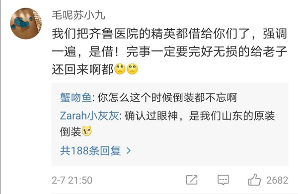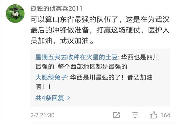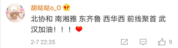 有網(wǎng)友表示,北協(xié)和、南湘雅、東齊魯、西華西,中國醫(yī)療界最頂尖的王炸帶上各省份的天團(tuán)會(huì)師武漢!今天看到最戳心的一句話是:全村的龍已把最硬的麟給你,哪怕自己也傷痕累累,所以,武漢,加油!