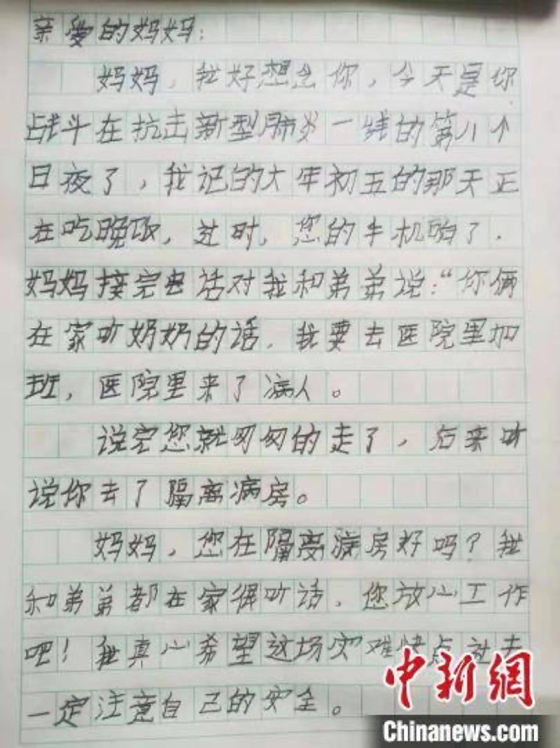 孩子在信中寫道:“媽媽,我好想念你,今天是您戰(zhàn)斗在抗擊新型肺炎一線的第八個(gè)日夜了……媽媽,你是我崇拜的英雄?!?/p>