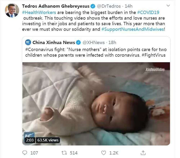 ↑世界衛(wèi)生組織總干事譚德塞轉(zhuǎn)發(fā)新華社海外社交媒體英文主賬號稿件《隔離點里的“臨時媽媽”》,贊譽中國醫(yī)護人員在新冠肺炎防治工作中付出的努力和愛心。