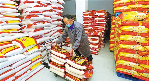 2月18日,四川建國(guó)順發(fā)商貿(mào)有限公司工人在搬卸大米。連日來,該公司每天加班加點(diǎn)為各大超市供應(yīng)大米。鐘 敏攝(中經(jīng)視覺)