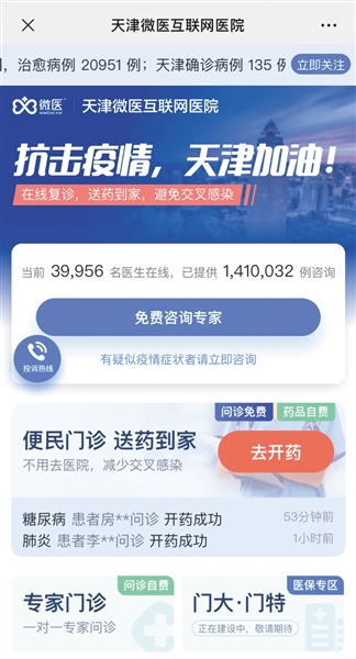 除針對新冠肺炎的免費義診之外,圍繞慢性病和常見病的便民門診、心理援助專區(qū)和醫(yī)護人員心理關懷通道也快速開通,天津微醫(yī)互聯(lián)網(wǎng)醫(yī)院率先成為天津抗擊疫情的“第二戰(zhàn)場”。