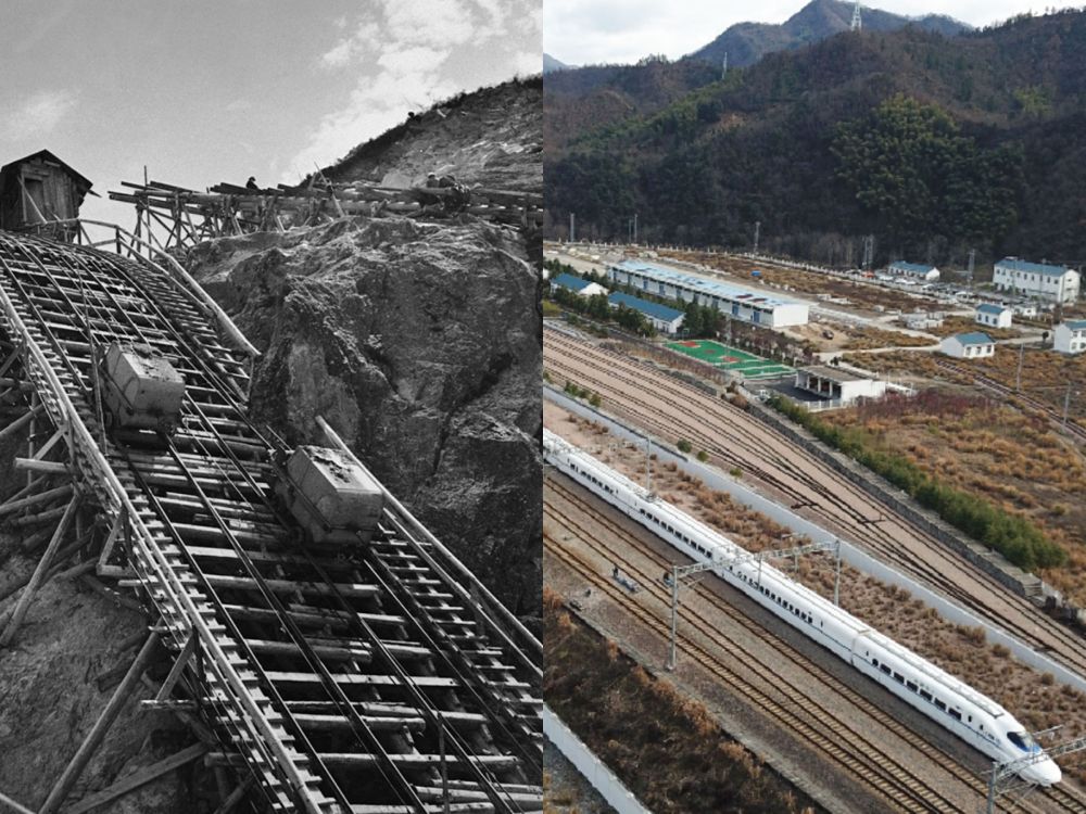 ?。ㄗ髨D:1957年金寨響洪甸水庫工地上吊車運(yùn)送混凝土,新華社稿王永嘉攝;右圖:2019年高鐵駛出金寨火車站。新華社記者張端攝)