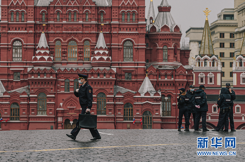 5月4日,一名警察(左)經(jīng)過俄羅斯莫斯科紅場(chǎng)。 為遏制新冠疫情蔓延,3月30日起莫斯科和俄多城實(shí)施居家隔離制度。 新華社發(fā)(葉甫蓋尼·西尼岑攝)