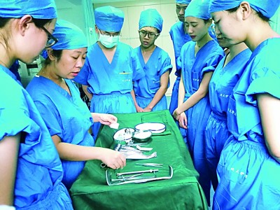 手術(shù)的順利進展離不開器械護士的準確傳遞。圖為北京大學護理學院學生正在老師引導下認識手術(shù)器械。李珂攝/光明圖片