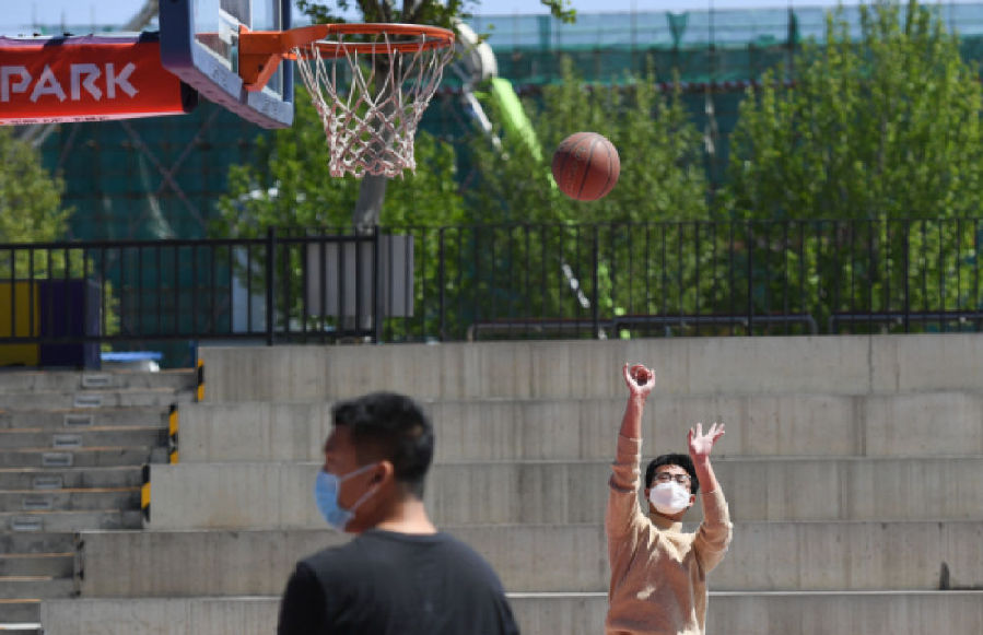 4月22日,市民通過實(shí)名預(yù)約場(chǎng)地,在北京市五棵松籃球公園室外球場(chǎng)打球 鞠煥宗/攝