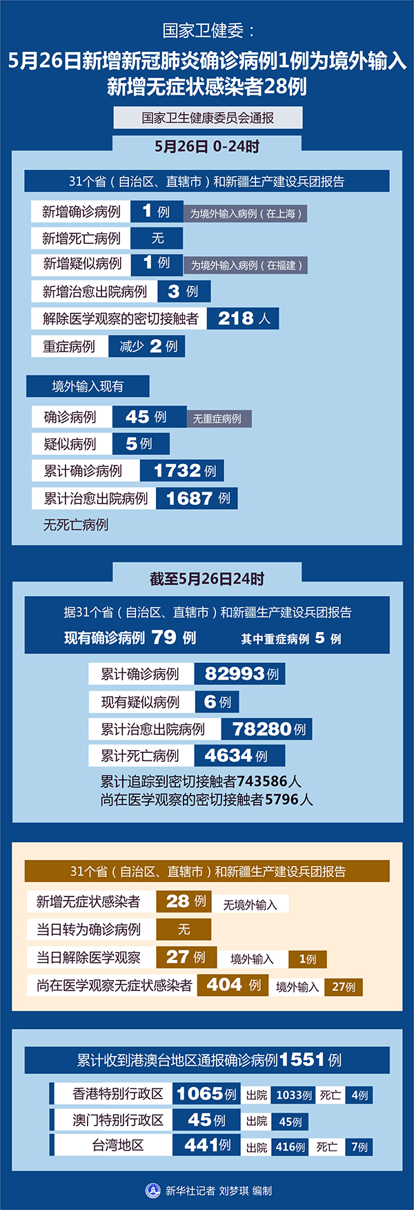 截至5月26日24時,據(jù)31個省(自治區(qū)、直轄市)和新疆生產(chǎn)建設(shè)兵團報告,現(xiàn)有確診病例79例(其中重癥病例5例),累計治愈出院病例78280例,累計死亡病例4634例,累計報告確診病例82993例,現(xiàn)有疑似病例6例。累計追蹤到密切接觸者743586人,尚在醫(yī)學(xué)觀察的密切接觸者5796人。