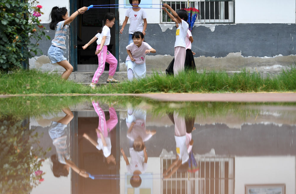 ↑?小思揚(yáng)(前左三)在課間和同學(xué)一起玩耍。