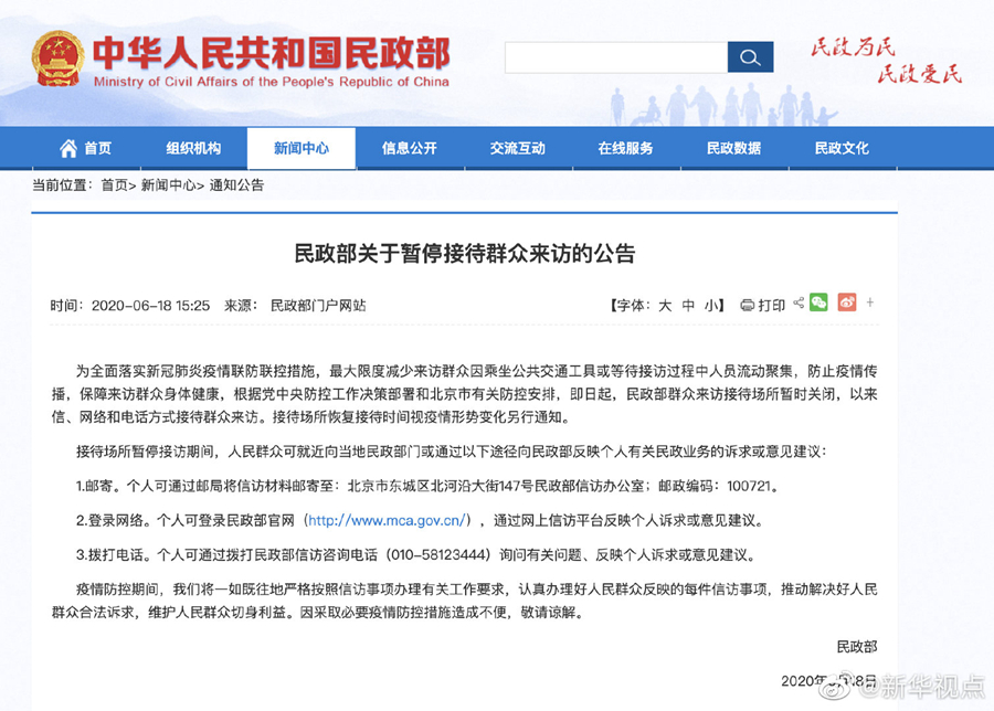 民政部18日發(fā)布消息,根據(jù)黨中央防控工作決策部署和北京市有關(guān)防控安排,即日起,民政部群眾來訪接待場(chǎng)所暫時(shí)關(guān)閉,以來信、網(wǎng)絡(luò)和電話方式接待群眾來訪。接待場(chǎng)所恢復(fù)接待時(shí)間視疫情形勢(shì)變化另行通知。(記者孫少龍) ????