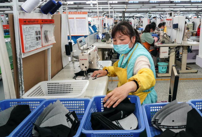 淮安源通制帽有限公司扶貧車間內,工人在生產(chǎn)帽子 楊磊 攝