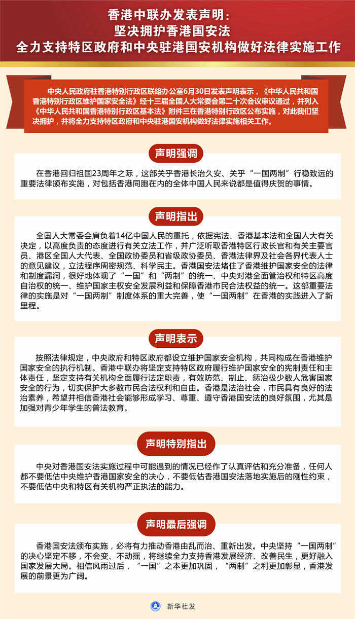 新華社香港6月30日電? 中央人民政府駐香港特別行政區(qū)聯(lián)絡辦公室30日發(fā)表聲明表示,《中華人民共和國香港特別行政區(qū)維護國家安全法》經(jīng)十三屆全國人大常委會第二十次會議審議通過,并列入《中華人民共和國香港特別行政區(qū)基本法》附件三在香港特別行政區(qū)公布實施,對此我們堅決擁護,并將全力支持特區(qū)政府和中央駐港國安機構(gòu)做好法律實施相關工作。