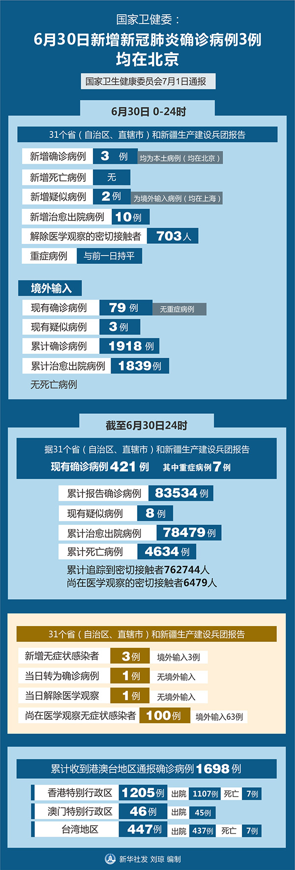 新華社北京7月1日電(記者胡喆)國家衛(wèi)生健康委員會7月1日通報,6月30日0-24時,31個?。ㄗ灾螀^(qū)、直轄市)和新疆生產建設兵團報告新增確診病例3例,均為本土病例(均在北京);無新增死亡病例;新增疑似病例2例,為境外輸入病例(均在上海)。