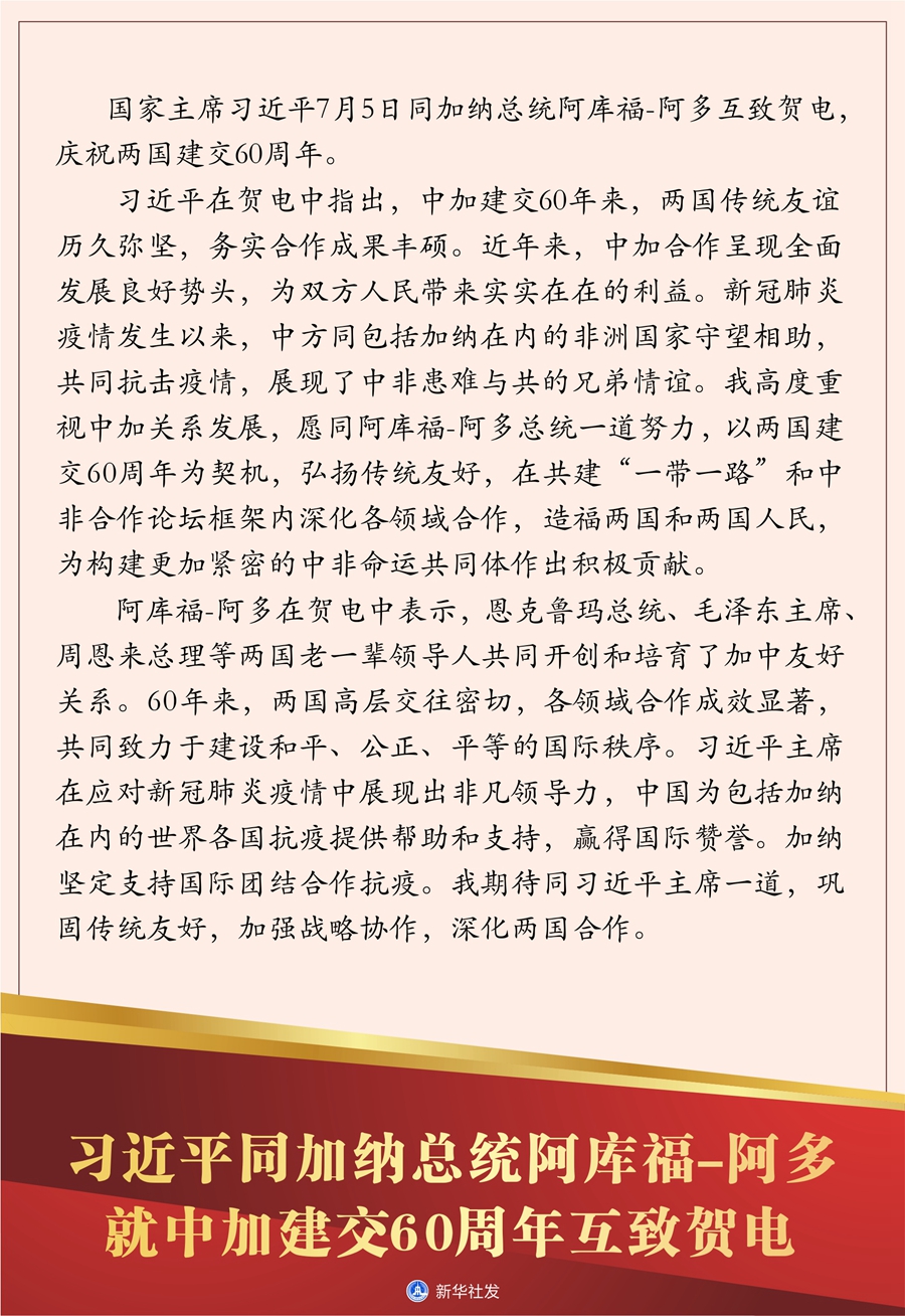 新華社北京7月5日電? 國(guó)家主席習(xí)近平7月5日同加納總統(tǒng)阿庫福-阿多互致賀電,慶祝兩國(guó)建交60周年。