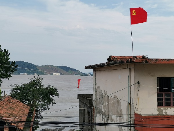江西省九江市紀(jì)委監(jiān)委黨員突擊隊(duì)在彭澤縣棉船鎮(zhèn)與群眾一起奮力抗汛,圖為黨旗在鎮(zhèn)渡輪碼頭高高飄揚(yáng)。許久 攝