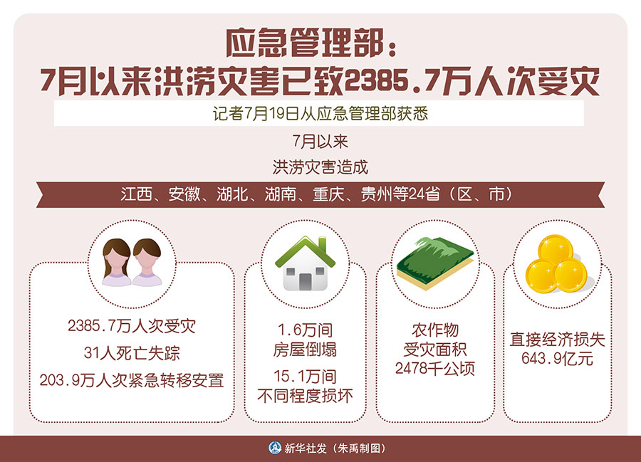 新華社北京7月19日電(記者魏玉坤)記者19日從應(yīng)急管理部獲悉,7月以來,洪澇災(zāi)害造成江西、安徽、湖北、湖南、重慶、貴州等24省(區(qū)、市)2385.7萬人次受災(zāi),31人死亡失蹤,203.9萬人次緊急轉(zhuǎn)移安置。