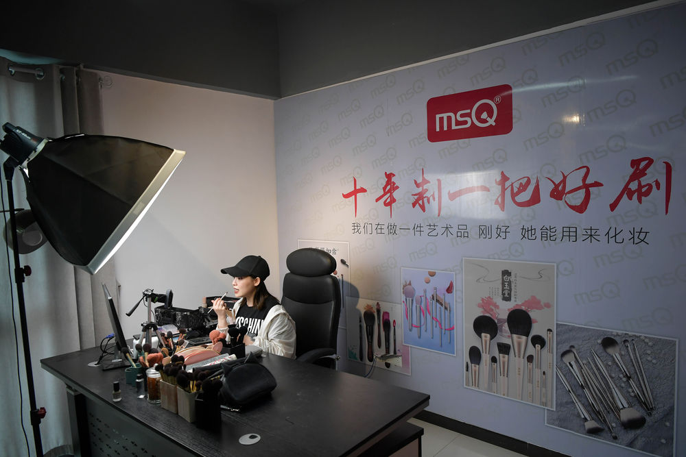 5月15日,在江西省南昌市青山湖區(qū)一家電商企業(yè)的直播間內(nèi),主播線上直播銷(xiāo)售化妝刷。新華社記者 彭昭之 攝