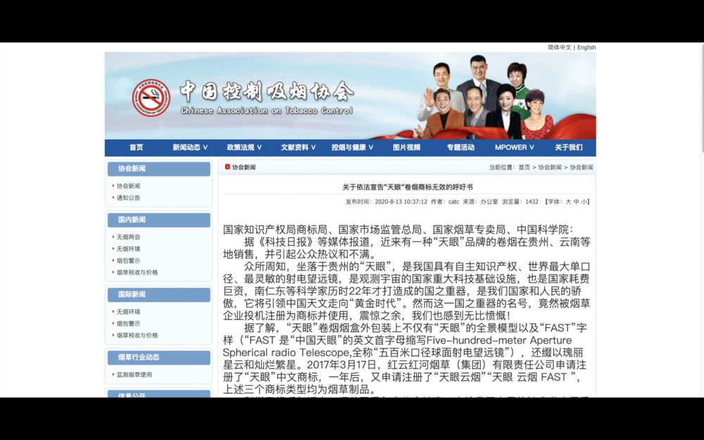 針對“天眼”被煙草企業(yè)注冊商標并使用一事,中國控制吸煙協(xié)會8月13日在其官網(wǎng)發(fā)布聲明,希望國家知識產(chǎn)權(quán)局商標局等部門對此事予以關(guān)注。