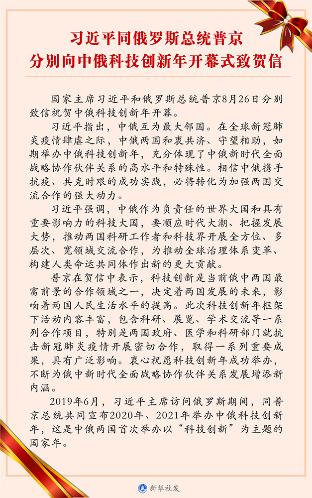 新華社北京8月26日電 國家主席習(xí)近平和俄羅斯總統(tǒng)普京26日分別致信祝賀中俄科技創(chuàng)新年開幕。