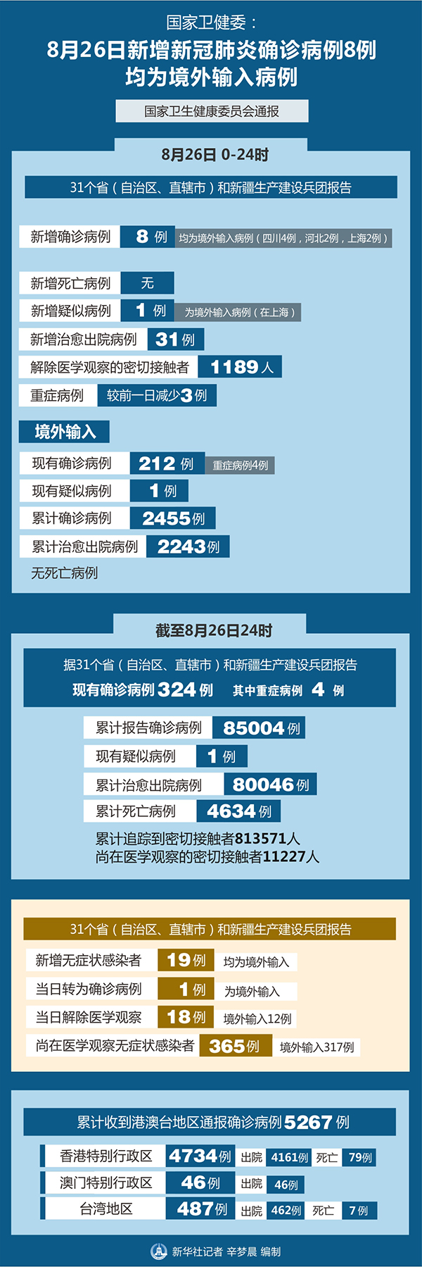 新華社北京8月27日電? 國(guó)家衛(wèi)健委27日通報(bào),8月26日0—24時(shí),31個(gè)?。ㄗ灾螀^(qū)、直轄市)和新疆生產(chǎn)建設(shè)兵團(tuán)報(bào)告新增確診病例8例,均為境外輸入病例(四川4例,河北2例,上海2例);無新增死亡病例;新增疑似病例1例,為境外輸入病例(在上海)。