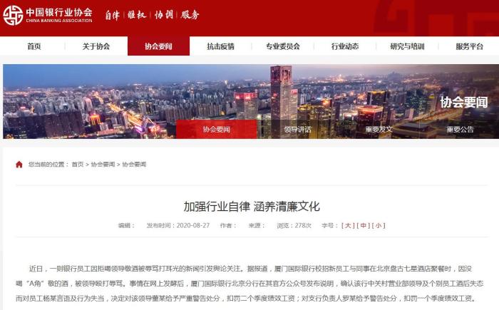 8月24日,廈門國際銀行北京分行發(fā)文證實此事并致歉。該行表示,員工楊某反映的中關村支行營業(yè)部某領導及該支行個別員工在私下非公款聚餐中,確系存在因酒后失態(tài)而對楊某做出言語及行為失當等舉動,上述行為確實對其本人造成了影響和傷害,對此深表歉意。