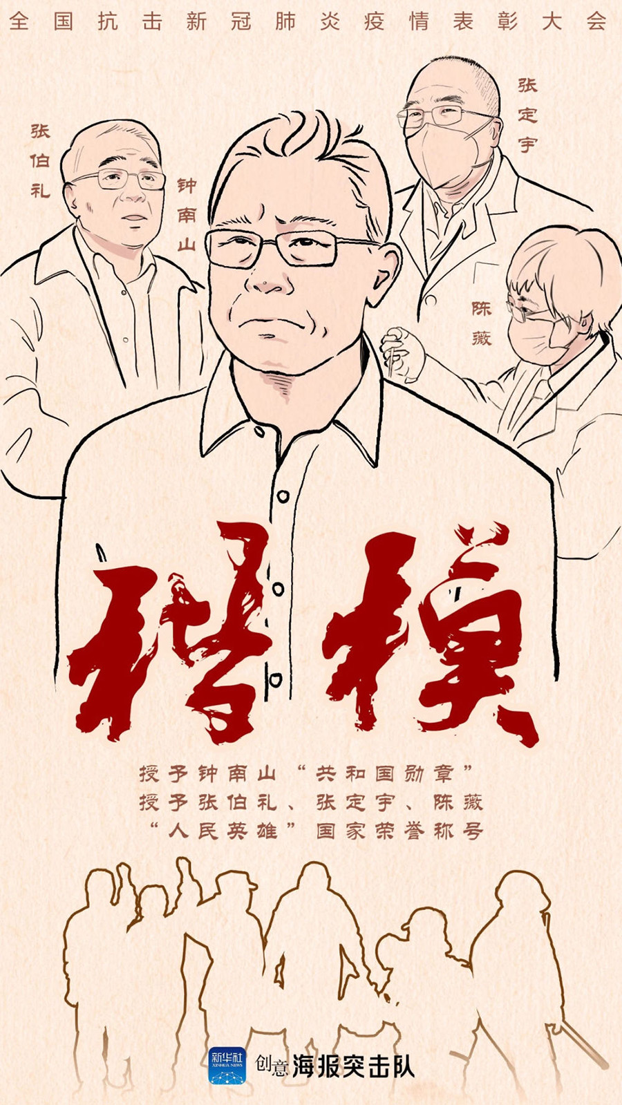 9月8日,全國(guó)抗擊新冠肺炎疫情表彰大會(huì)在北京人民大會(huì)堂隆重舉行。中共中央總書記、國(guó)家主席、中央軍委主席習(xí)近平向“共和國(guó)勛章”獲得者鐘南山(前排右二),“人民英雄”國(guó)家榮譽(yù)稱號(hào)獲得者張伯禮(前排左二)、張定宇(前排右一)、陳薇(前排左一)頒授勛章獎(jiǎng)?wù)隆?新華社記者 謝環(huán)馳 攝