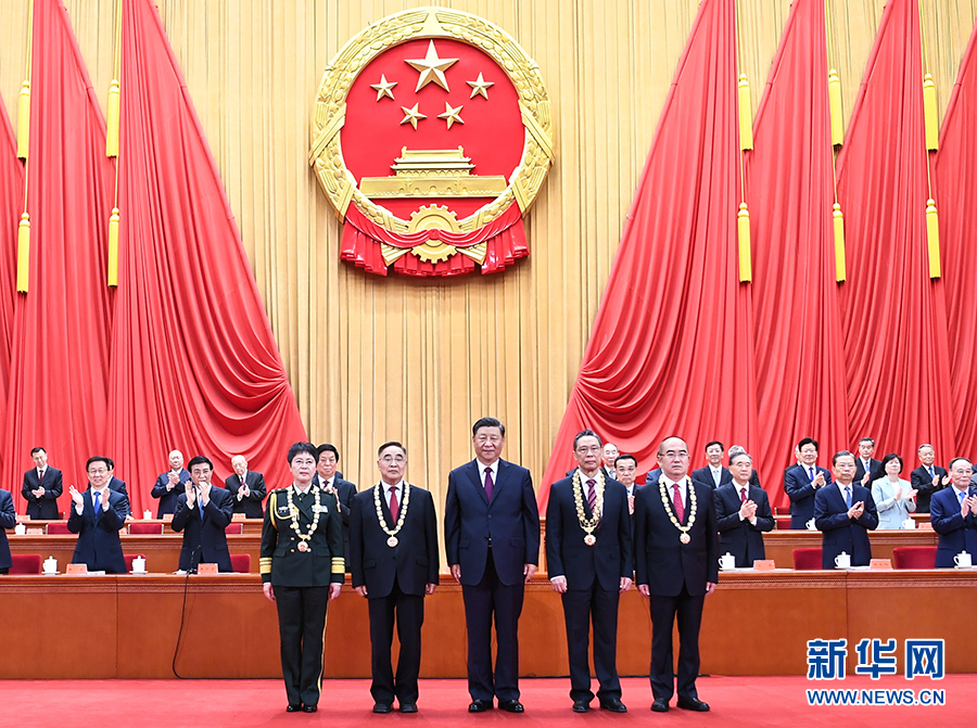 在全場(chǎng)熱烈的掌聲中,在人們崇敬的目光注視下,4位國(guó)家勛章和國(guó)家榮譽(yù)稱號(hào)獲得者受邀到主席臺(tái)就座。