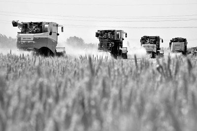 在山東省汶上縣郭倉鎮(zhèn),收割機在收獲小麥。新華社發(fā)