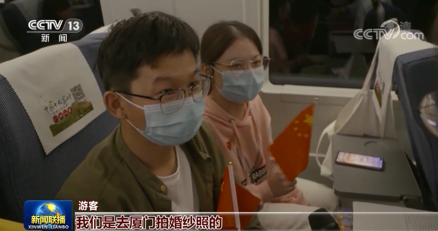 游客:我們是去廈門(mén)拍婚紗照的,沿邊的風(fēng)景都很好看,我們剛才把五星紅旗跟藍(lán)天還比著,拍了個(gè)照片,每天都讓我們自己有種愛(ài)上祖國(guó)新的那種感動(dòng)。