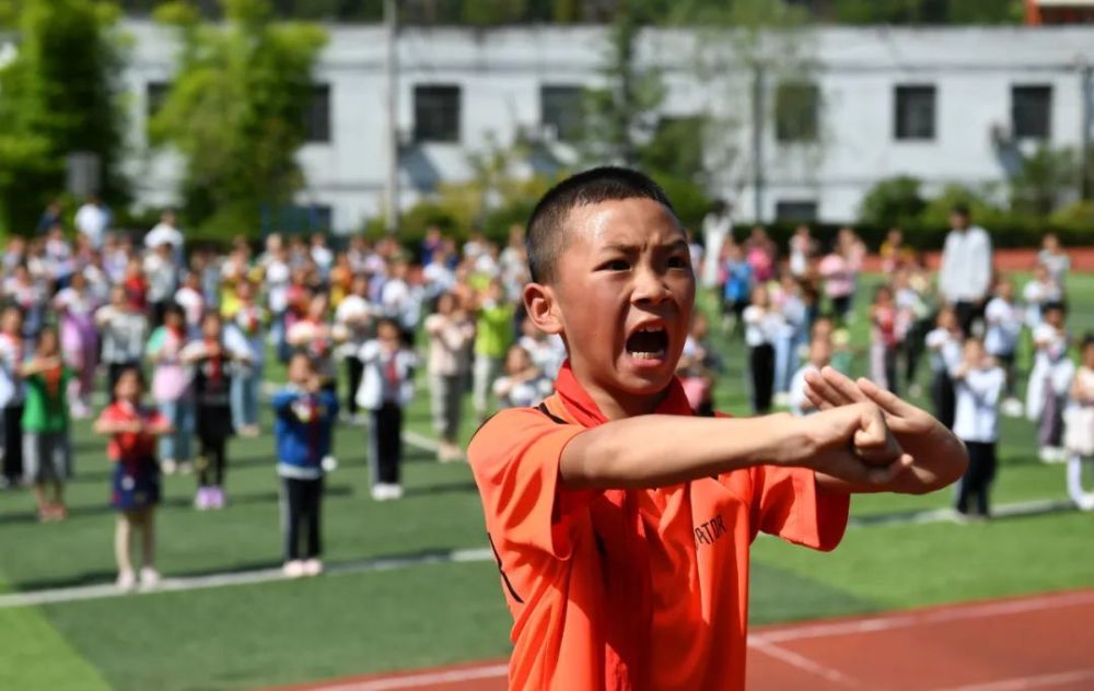 9月8日,在陜西平利老縣鎮(zhèn)中心小學的操場上,學生沈首洋(前)在大課間武術(shù)操上領(lǐng)操。新華社記者 李一博 攝