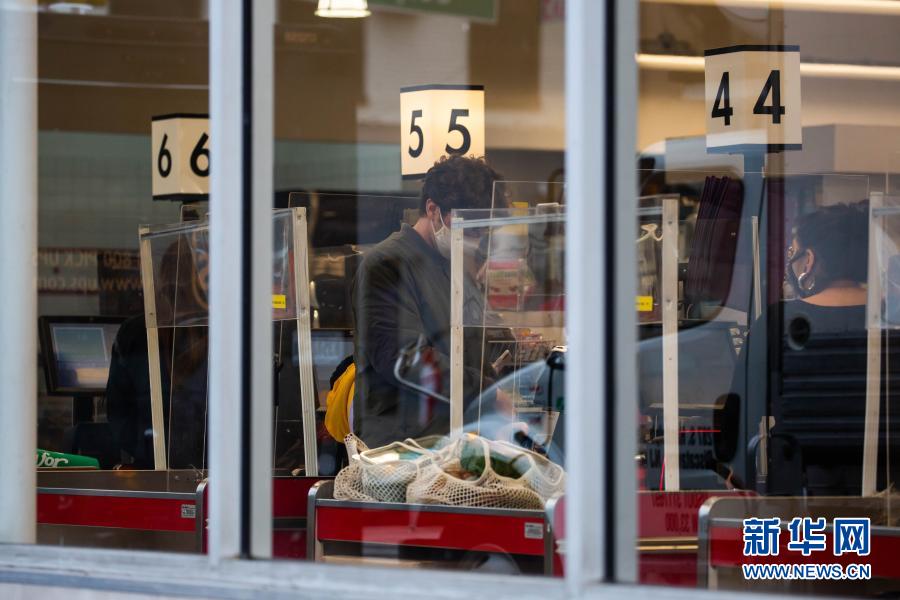 11月12日,在美國紐約一家超市,人們在裝有防護罩的收銀臺前結(jié)賬。新華社發(fā)(郭克攝)