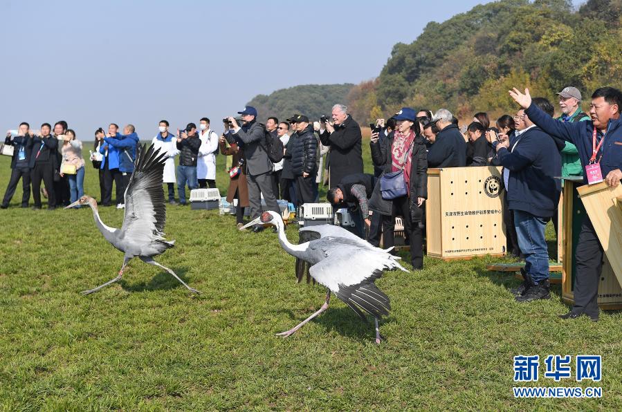 2019年12月8日,國內(nèi)多家野生動(dòng)物保護(hù)機(jī)構(gòu)在江西鄱陽湖國家級(jí)自然保護(hù)區(qū)將120只被救治的珍稀候鳥成功放飛。這是工作人員放飛兩只白枕鶴。新華社記者 萬象 攝