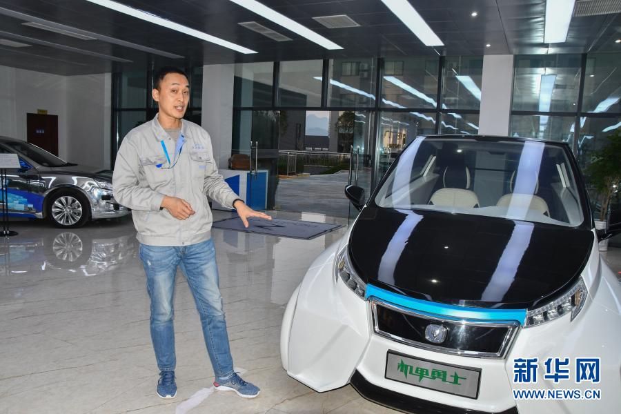 在四川省廣安市鄰水縣川渝合作高灘園區(qū),四川瑞創(chuàng)汽車科技有限公司技術總監(jiān)李效輝在介紹一款可原地旋轉和橫向移動的新型汽車(11月12日攝)。新華社記者 周相吉 攝