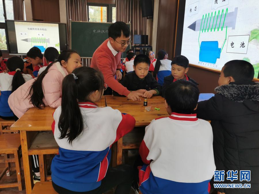 在重慶市石柱土家族自治縣中益鄉(xiāng)小學,唐大鵬(中)給孩子們上科學課(10月20日攝)。新華社發(fā)(劉婷 攝)