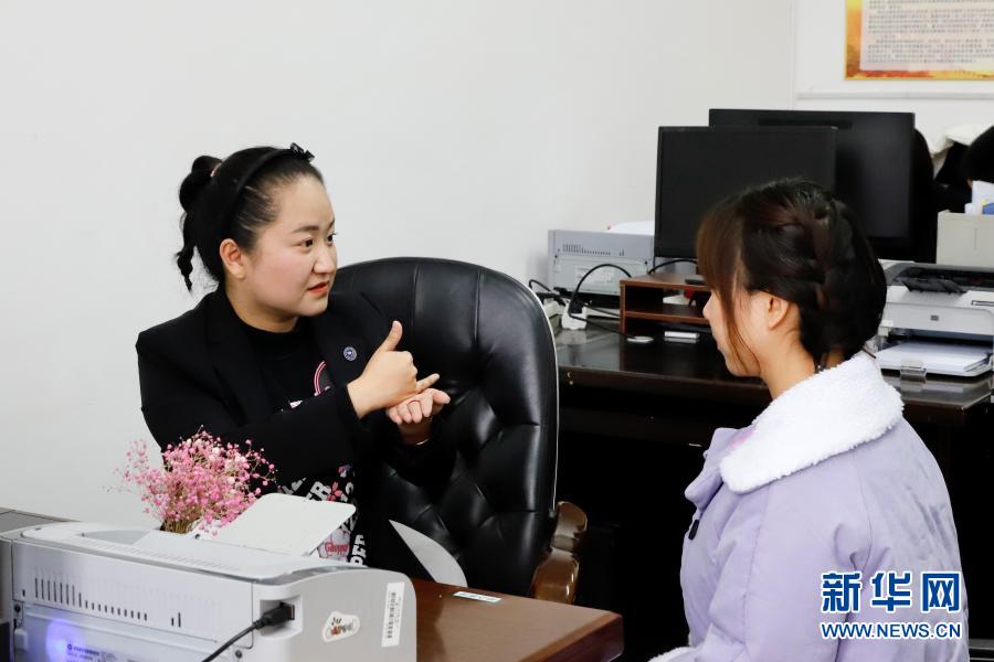 11月18日,在黑龍江綏化學院,李澤卉(左)用手語和學生交流。新華社發(fā)(黃龍斌 攝)