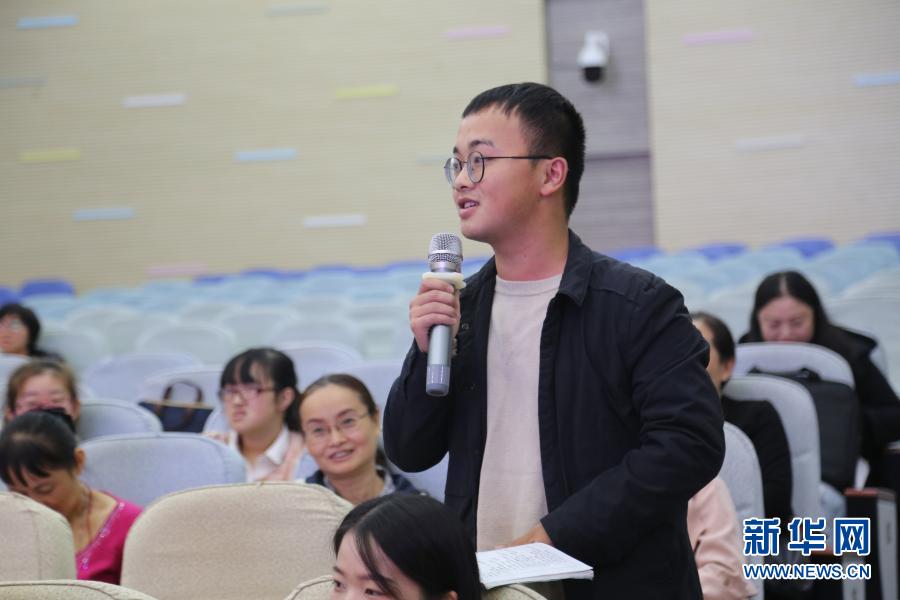 在重慶市南岸區(qū)南坪實驗小學,唐大鵬在教研活動上發(fā)言(2019年10月22日攝)。新華社發(fā)(張劍 攝)