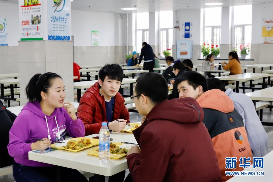 11月18日,在黑龍江綏化學院,李澤卉(左一)與學生一起吃飯。新華社發(fā)(黃龍斌 攝)
