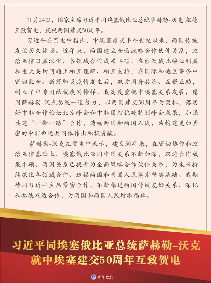 新華社北京11月24日電? 11月24日,國家主席習近平同埃塞俄比亞總統(tǒng)薩赫勒-沃克·祖德互致賀電,慶祝兩國建交50周年。