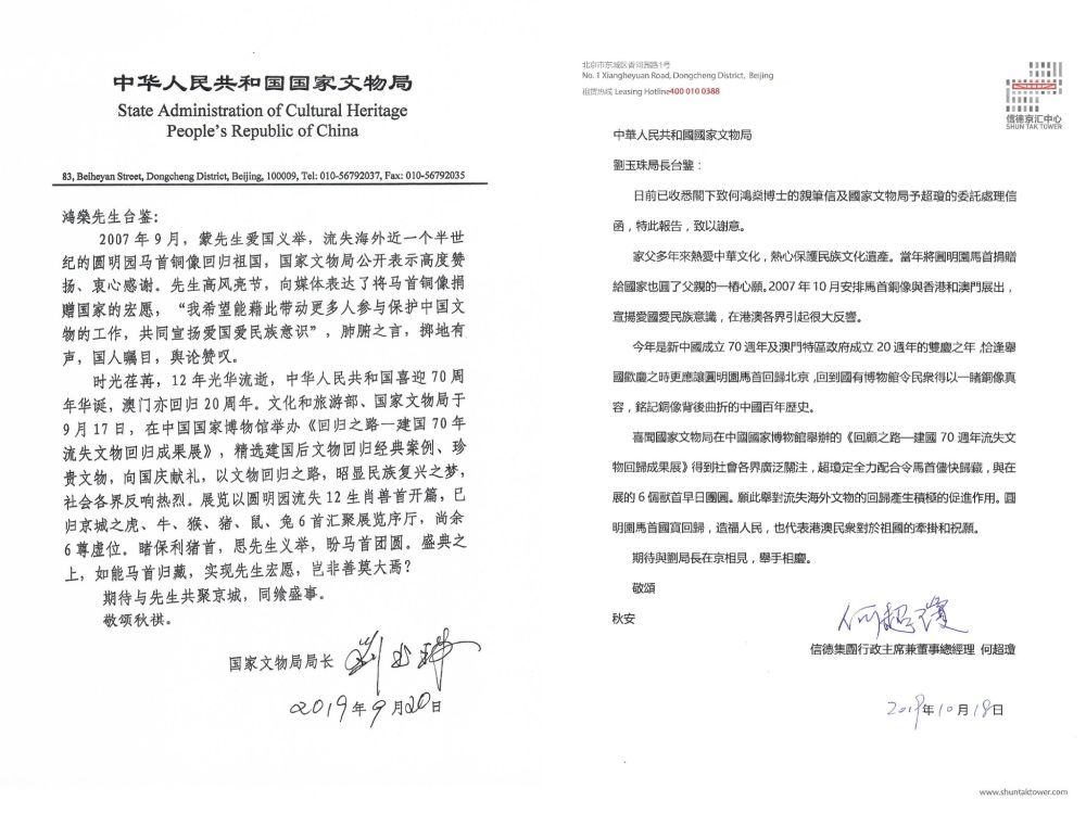 2019年11月,為慶祝中華人民共和國成立70周年和澳門回歸20周年,在國家文物局積極溝通協(xié)調(diào)下,何鴻燊先生決定將圓明園馬首銅像正式捐贈(zèng)國家文物局。