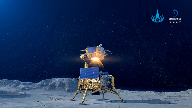 12月3日23時10分,嫦娥五號上升器月面點火,3000 牛發(fā)動機工作約6 分鐘后,順利將攜帶月壤的上升器送入到預(yù)定環(huán)月軌道,成功實現(xiàn)我國首次地外天體起飛。這是嫦娥五號上升器月面點火瞬間模擬 圖國家航天局供圖