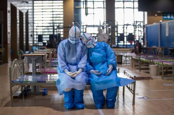 3月10日,兩名青海醫(yī)療隊隊員在武昌方艙醫(yī)院等待出艙時小憩。