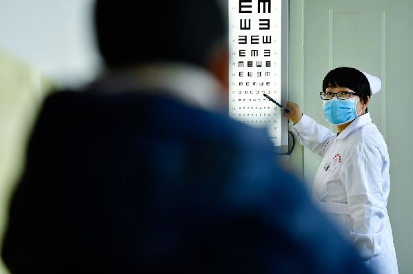 12月16日,海東市第二人民醫(yī)院眼科護士許國娟在給患者檢查視力。