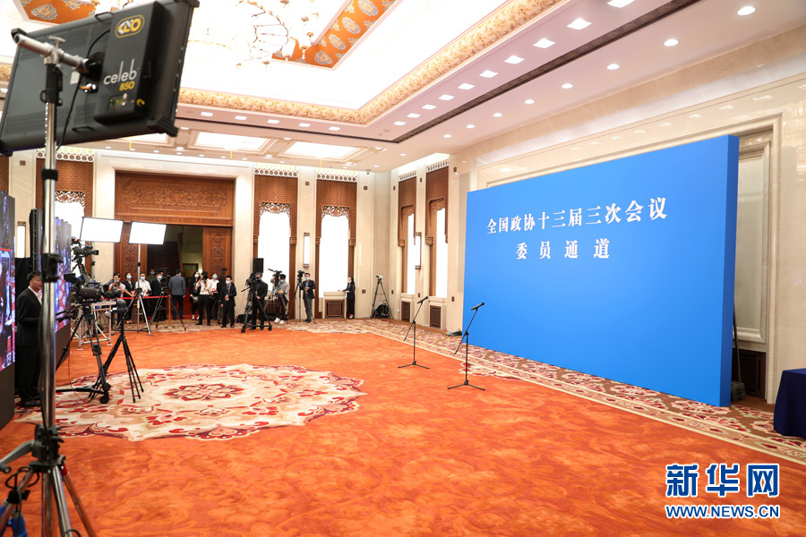 ??? 全國政協(xié)十三屆三次會議首場“委員通道”采訪活動于5月21日在人民大會堂新聞發(fā)布廳舉行,邀請部分全國政協(xié)委員通過網(wǎng)絡(luò)視頻方式接受媒體采訪。圖為“委員通道”現(xiàn)場。新華網(wǎng) 王翰林 攝
