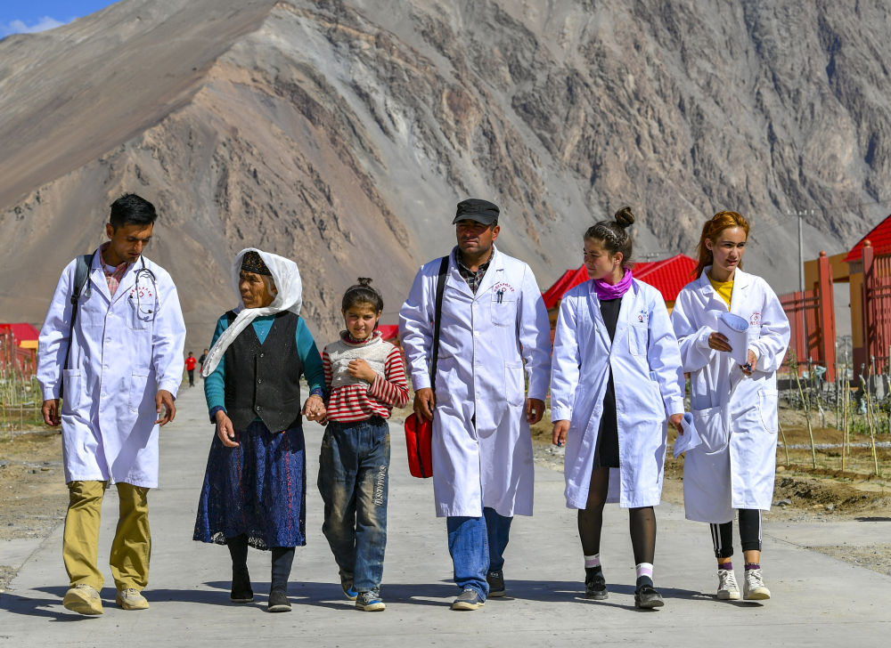 新疆塔什庫爾干塔吉克自治縣達(dá)布達(dá)爾鄉(xiāng)熱斯喀木村村醫(yī)發(fā)爾亞特·塔西白克(右三)與醫(yī)務(wù)人員來到當(dāng)?shù)匾椎胤鲐毎徇w安置點出診(2019年7月7日攝)。新華社記者 胡虎虎 攝
