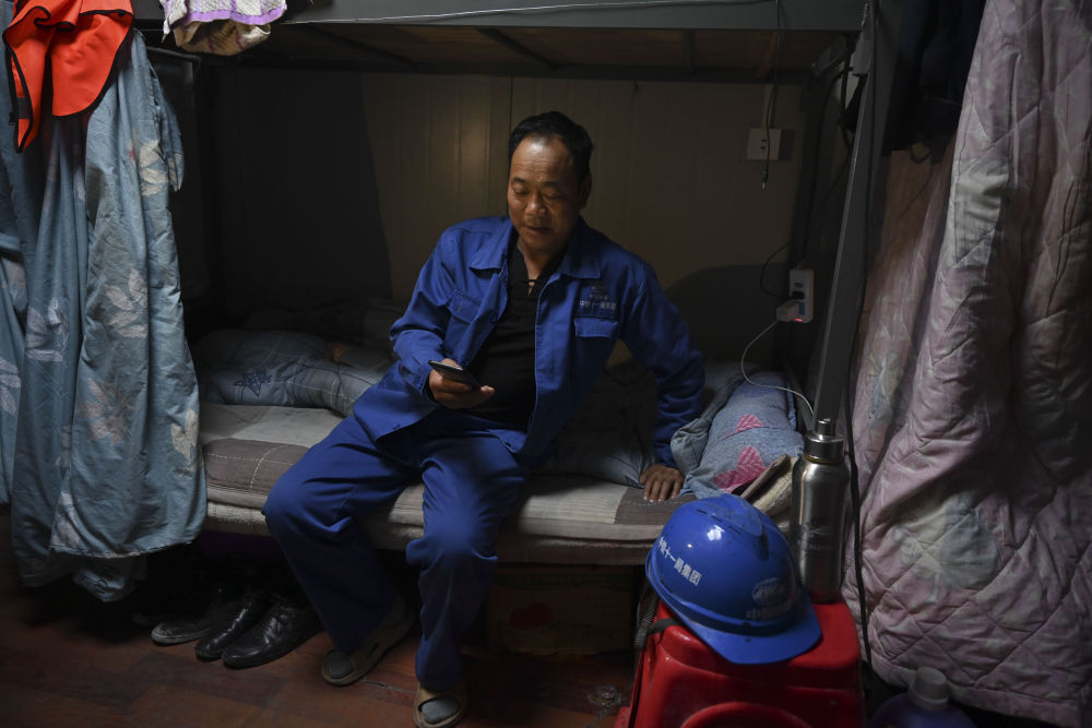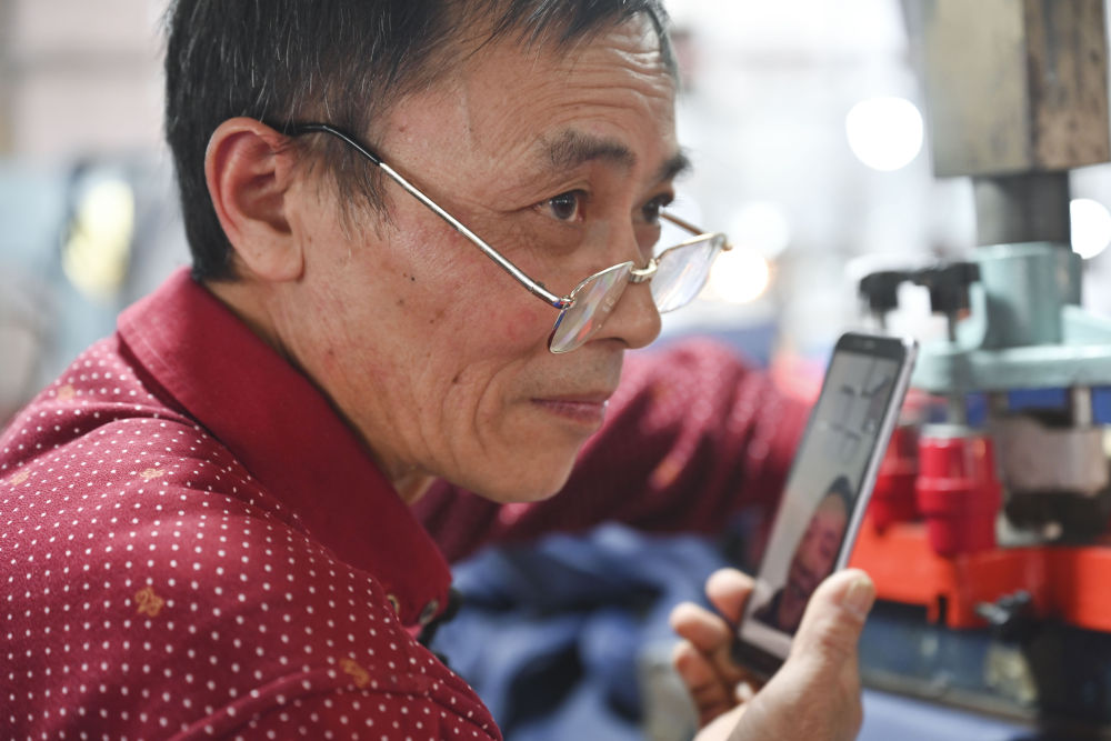 1月25日,在福建省福州市閩侯縣的億格戶外用品有限公司生產(chǎn)車間,四川籍計(jì)件工人張良國在休息時(shí)與大兒子視頻通話。