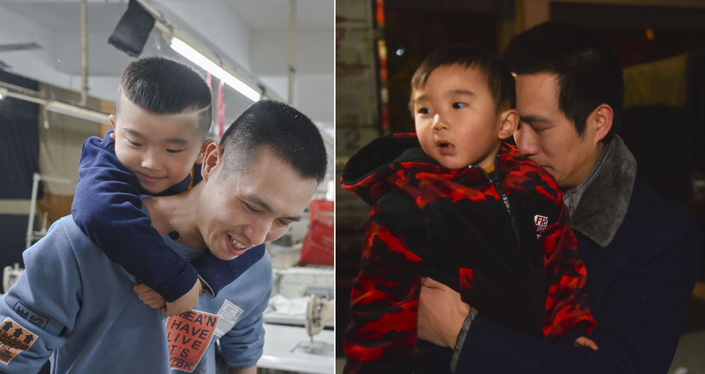 左圖為2021年1月26日,在福建省石獅市的金利萊斯服裝廠,聰聰和黃海龍?jiān)谝黄穑挥覉D為2018年2月2日凌晨,黃海龍即將登上返回四川的長途車,在上車前抱著不滿3歲的聰聰難舍難分。