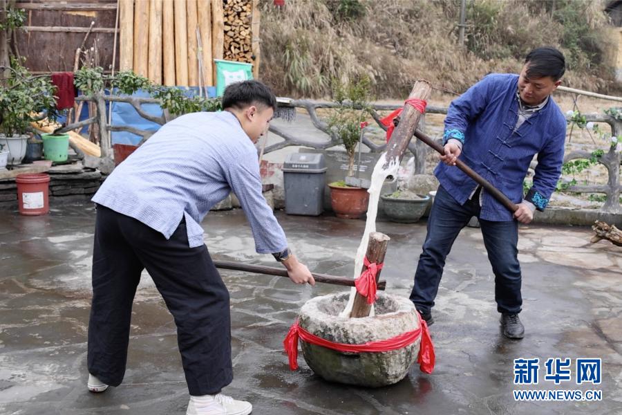 2月3日,在湖南省湘西土家族苗族自治州花垣縣十八洞村,村民在打糍粑,儲備過年物資。 新華社記者 陳思汗 攝