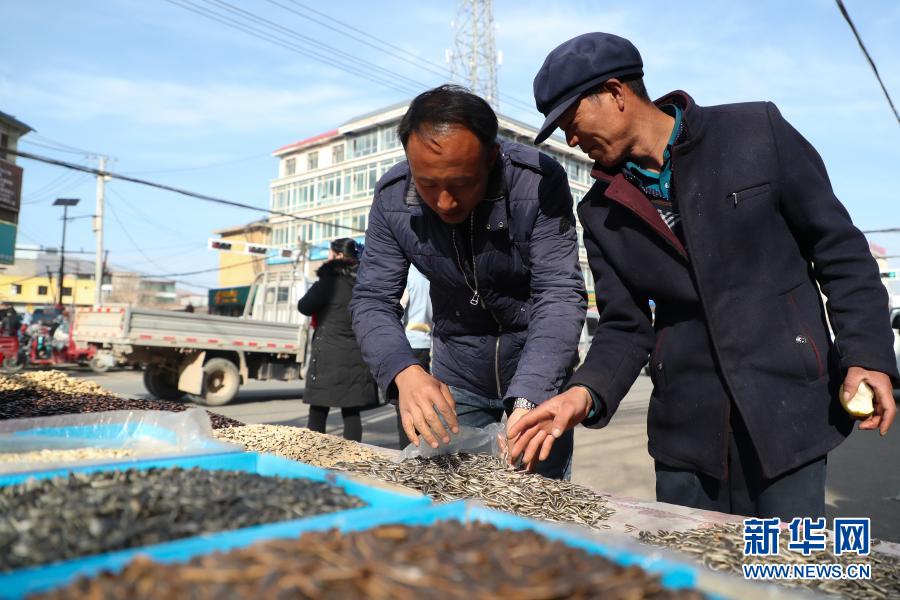 2月7日,在甘肅省定西市渭源縣會川鎮(zhèn)集市上,元古堆村村民曾玉成(右)在置辦年貨。 新華社記者 馬希平 攝