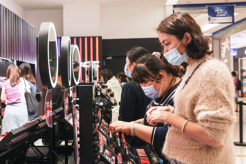 消費者在??谌赵聫V場免稅店購物。(新華社記者張麗蕓2021年3月25日攝)