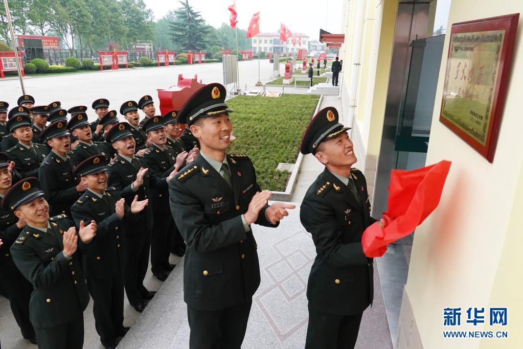 陸軍第83集團(tuán)軍某旅“紅一連”官兵在連隊(duì)門(mén)前懸掛“星火燎原”育人基地牌匾(4月23日攝)。新華社記者 張永進(jìn) 攝