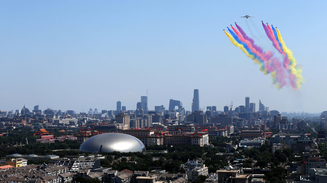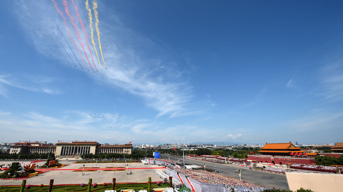 - 空中護旗方隊率先飛過天安門上空