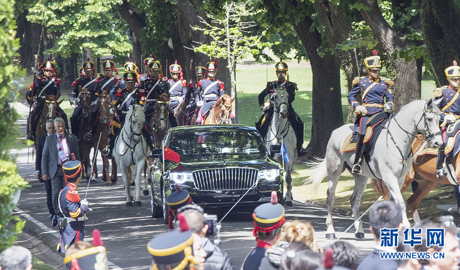 習(xí)近平和夫人彭麗媛在馬隊護(hù)衛(wèi)下前往總統(tǒng)官邸,禮兵在林蔭大道兩側(cè)列隊接受檢閱。抵達(dá)榮譽(yù)廣場時,軍樂團(tuán)奏響歡快的進(jìn)行曲。馬克里和夫人阿瓦達(dá)上前熱情迎接。兩國元首夫婦登上檢閱臺。軍樂團(tuán)奏中國、阿根廷兩國國歌。